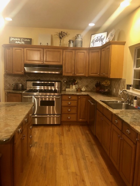 Pairing the clean look of white cabinets in our pearl finish with our deep smokey hills on the gray island, the result is a match made in finish heaven.